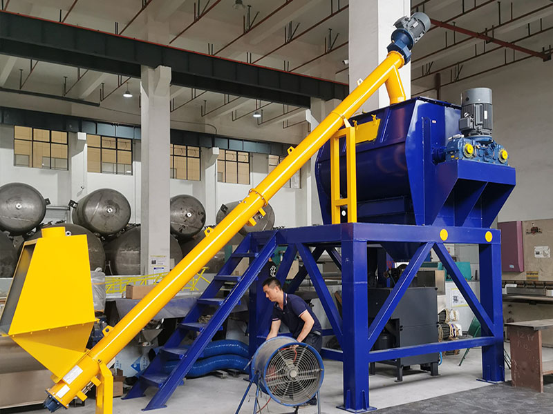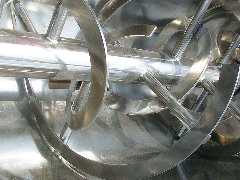 2. 第二步是混合,當物料輸入到工作室后,螺旋螺桿開始旋轉,將物料推向機殼的一端。同時,螺帶內的螺旋螺桿不斷地將物料向上提升,并使其沿著螺旋線方向進行運動。這種旋轉和提升的運動有效地將物料進行攪拌、抓取和推動,從而實現物料的混合作用。
